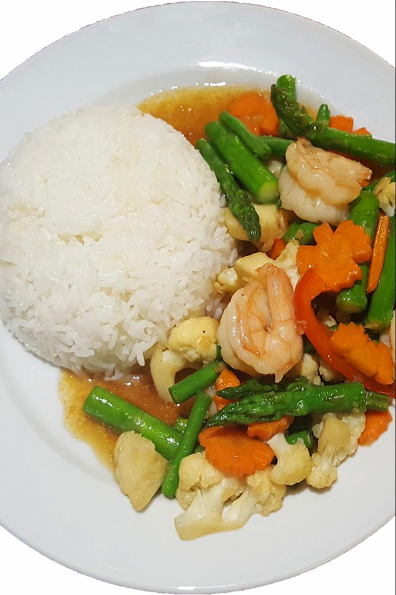 Scampi med hvitløk, grønnsaker og ris.Alergener: Soya, skalldyr