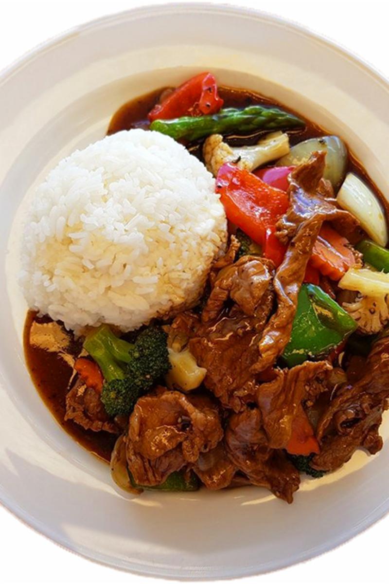 Serveres med grønnsaker og ris, beef og svart pepper. Allergener: soya, bløtdyr