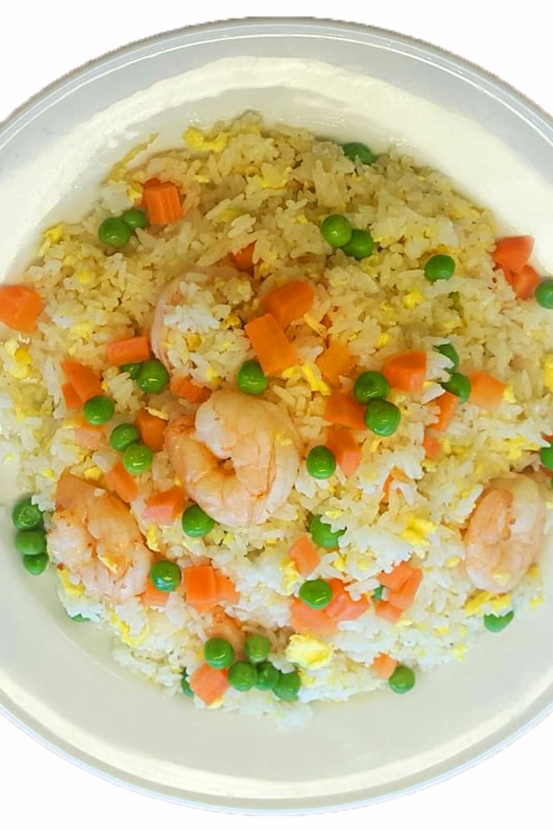 Serveres, kylling - scampi - svin. Allergener: egg, skalldyr og soya